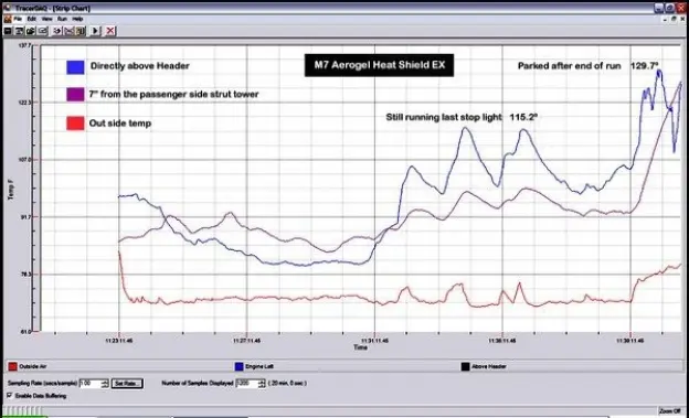 The Testing: We decided to bite the bullet and invested in some serious data logging equipment and a Thermal Imaging Camera that would give us both hard numbers and visual feedback to the thermal heat load under the hood. The testing showed some amazing results. The data logging revealed an amazing 65.8ï¿_ Delta in regular driving (both runs were identical) with some very small deviations in speed and the number of stop lights that turned red. The run was executed with mixed driving on the freeway at high rpm to generate as much heat as possible and stop and go traffic on surface streets.